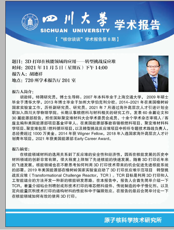 【“核你谈谈”学术报告第8期】胡逊祥研究员:3D打印在核能领域的应用 — 转型挑战反应堆