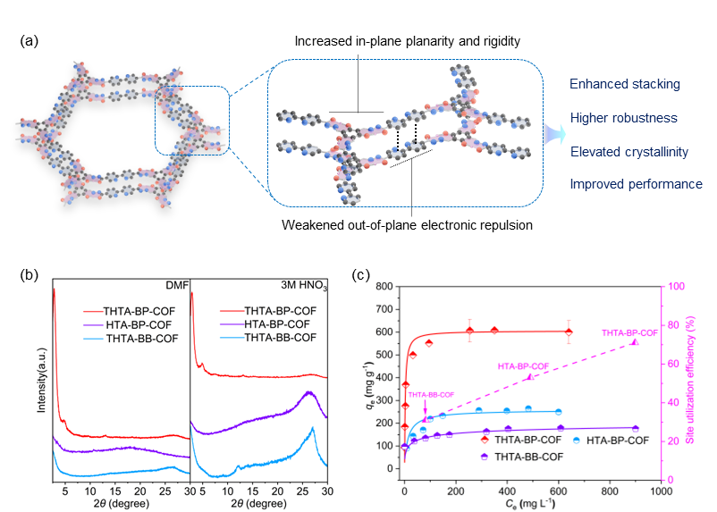 图1.(a)多维度超分子策略调控平面内外相互作用提高COF结晶性和稳定性;(b)材料稳定性及结晶性测试;(c)材料对裂变产物钯离子的高效吸附。